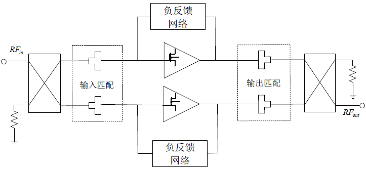 此宽带线性功率放大器的工作频率带宽达到近五个倍频程,工作频带宽,线性要求较高,综合考虑波形峰均比以致输出峰值功率较大,且同时兼顾小型化设计需求,采用两级功率放大器级联的方式可以满足方案设计目标。两级功率放大器均采用平衡式负反馈结构并工作于甲乙类[1]。射频信号从推动级功率放大器输入端进入,经过两级放大与输入输出阻抗匹配后,由末级功率放大器输出端输出,得到所需要的大功率信号。
