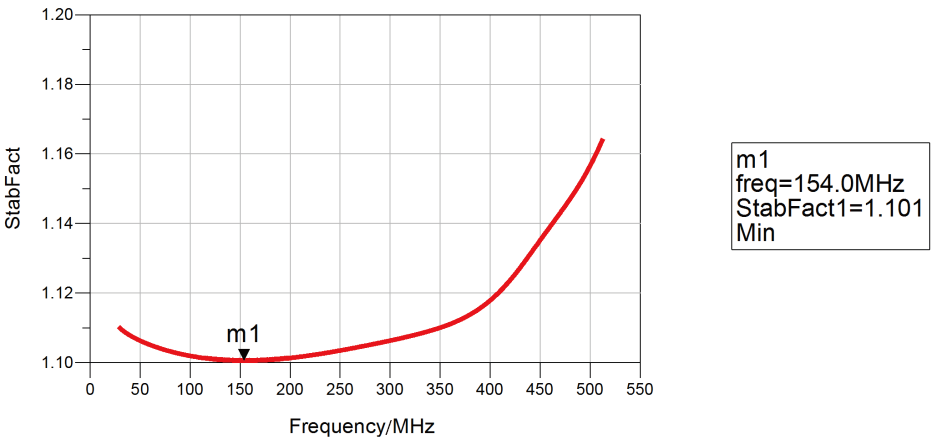 电阻直接负反馈技术是实现宽带功放比较常用的技术,本方案中通过在漏栅极加入电阻直接负反馈网络来提高电路的稳定性,并且在栅极端加入对地电阻与电容,进一步优化整个频带内增益平坦度和阻抗匹配,同时也改善稳定性。加入稳定电路后,稳定系数仿线 稳定系数仿真结果图