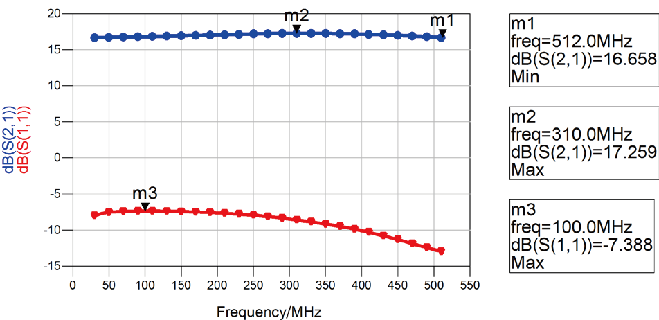 匹配完成后,若某些频点处未能达到具体要求,需要对整个匹配电路进行调整。通过仿真优化整个匹配网络,改善整体性能指标,经过优化后,S 参数仿真结果如图所示。从仿真结果可以看出,在整个工作频带(30 ~ 512)MHz 中,放大器的回波损耗S11 小于-7 dB,小信号增益S21 在17 dB 左右,小信号增益平坦度小于±1 dB,基本满足总体方案的设计要求,仿线 所示。
