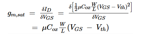 正如我们所知,MOSFET将输入电压转换为输出电流。小信号输出电流与小信号输入电压的比率称为跨导(gm)。我们也可以将跨导视为输出电流对栅源电压的导数。