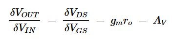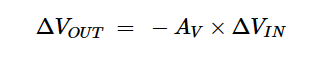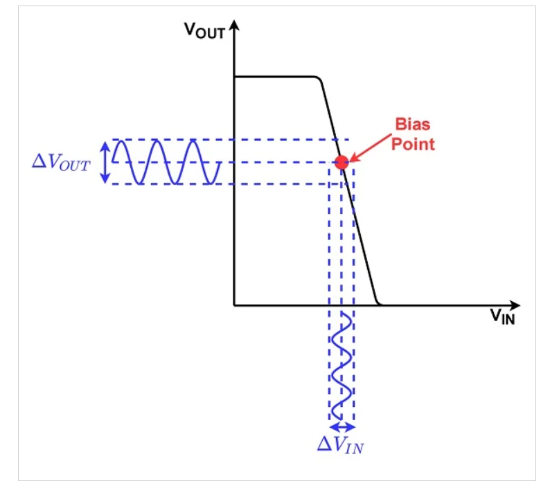 在小信号分析中,我们在直流偏置电压上施加一个非常小的交流信号(ΔVIN)。根据偏置点处的传递特性的斜率(–AV),放大产生的交流输出电压: