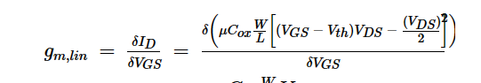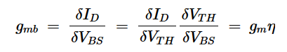 我们需要推导的最后一个小信号参数是体效应跨导(gmb),它描述了体效应如何影响漏极电流。我们可以计算如下: