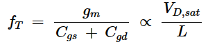 从图6中我们可以看到,图3中的MOSFET的固有增益具有单极低通传递函数。我们现在可以计算晶体管的带宽,在这种情况下,带宽将是电压增益等于1(0 dB)的频率。这被称为单位增益频率(fT)。