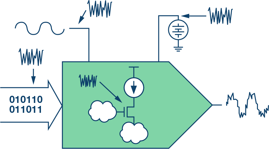从一块白板开始,首先将DAC视作一个模块。噪声可能来自内部,因为任何实际元器件都会产生某种噪声;也可能来自外部噪声源。外部噪声源可通过DAC的任何外部的任何外部任意连接,包括电源、时钟和数字接口等,进入其中。图1显示了这些可能性。下面将对每一种可能的噪声嫌疑对象分别进行研究,以了解其重要性。