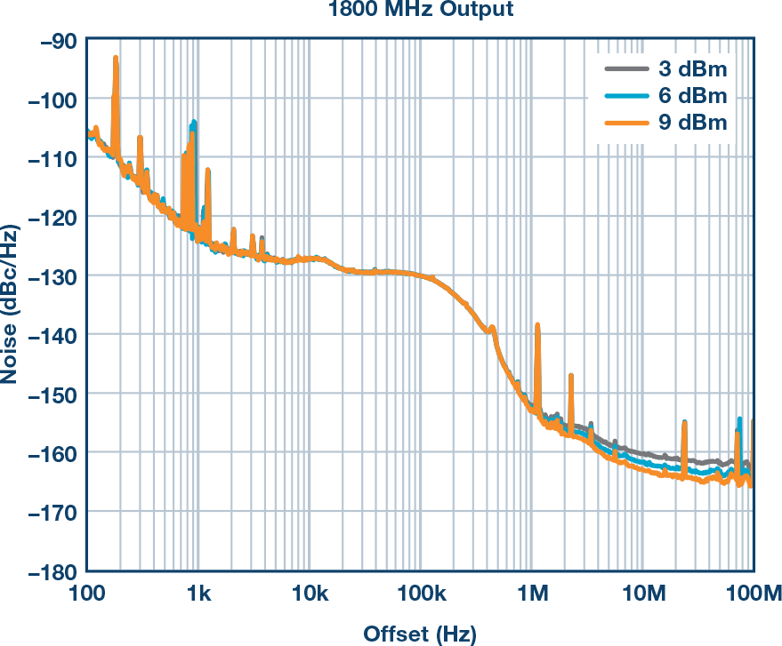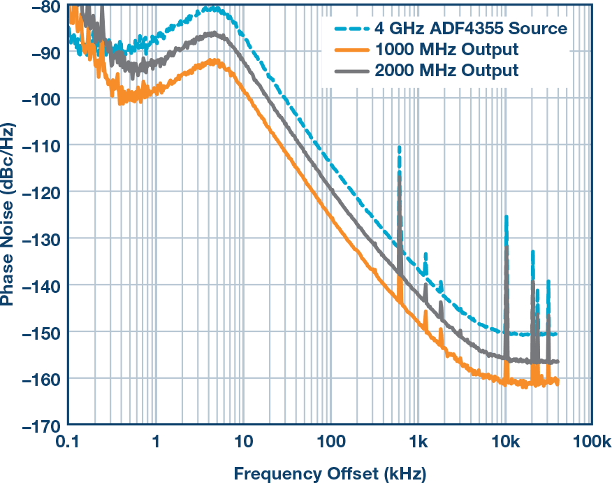 精密受控的实验固然好,但我们关心的是实际噪声。用宽带频率合成器ADF4355代替发生器,图8显示了新时钟源的相位噪声曲线,对应的DAC输出为时钟频率的½和¼。噪声特性得到保留,每次降低6 dB。应注意,PLL未针对最佳相位噪声而优化。目光敏锐的读者会注意到,在小偏移处有一些预期偏差,但这是不同基准源引起的正常现象。