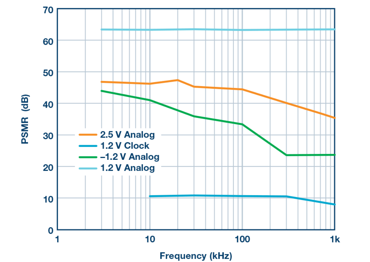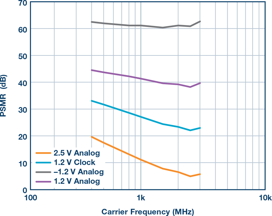 使用PSMR之前,应注意几点。不同于PSRR,PSMR取决于波形功率或数字倒退(后者就DAC而言)。信号功率越低,则边带越低,比例关系为1:1。但是,回退回退倒退对设计人员无益,因为边带相对于载波是恒定的。第二点是与载波频率的相关性。载波扫描显示,在较高频段时性能会以不同速率发生线性衰减。有意思的是,供电轨越敏感,斜率越陡。例如,时钟电源的斜率为–6.4 dB/倍频程,而负模拟电源的斜率为–4.5 dB/倍频程。采样速率也会影响PSMR。最后,PSMR仅提供相位噪声贡献的上限,因为它并未与同时产生的幅度噪声区分开来。