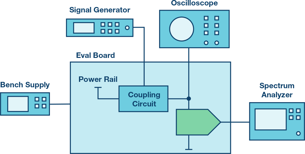存在多种不同的耦合机制。ADI公司应用工程师Rob Reeder在应用笔记 MS-2210《高速ADC的电源设计》中解释了如何利用LC电路来测量ADC的PSMR。其他选项包括电源运算放大器、变压器或专用调制电源。这里使用的方法是变压器。建议使用高匝数比以降低信号发生器的源阻抗。图14显示了典型测量结果。