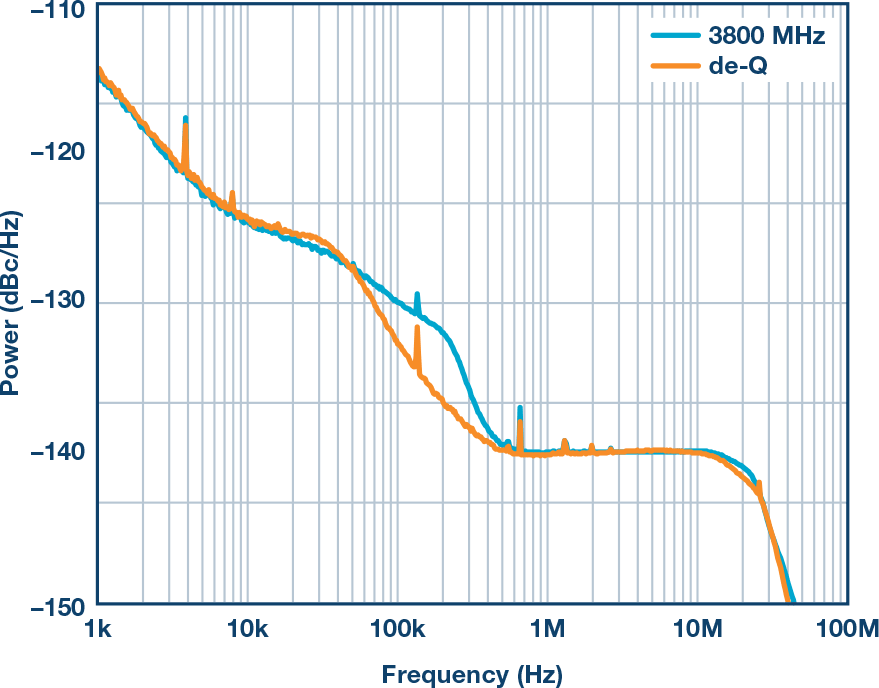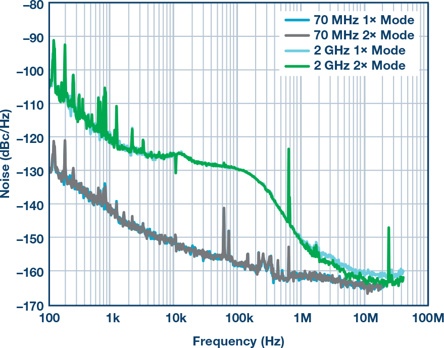 为了证明I/O是否需要关切,我们比较了AD9162系列高速DAC器件开启和关闭数字接口两种情况下的相位噪声。无数字接口时,器件的NCO模式内部生成波形,DAC事实上变成DDS发生器。图2显示了实验结果。