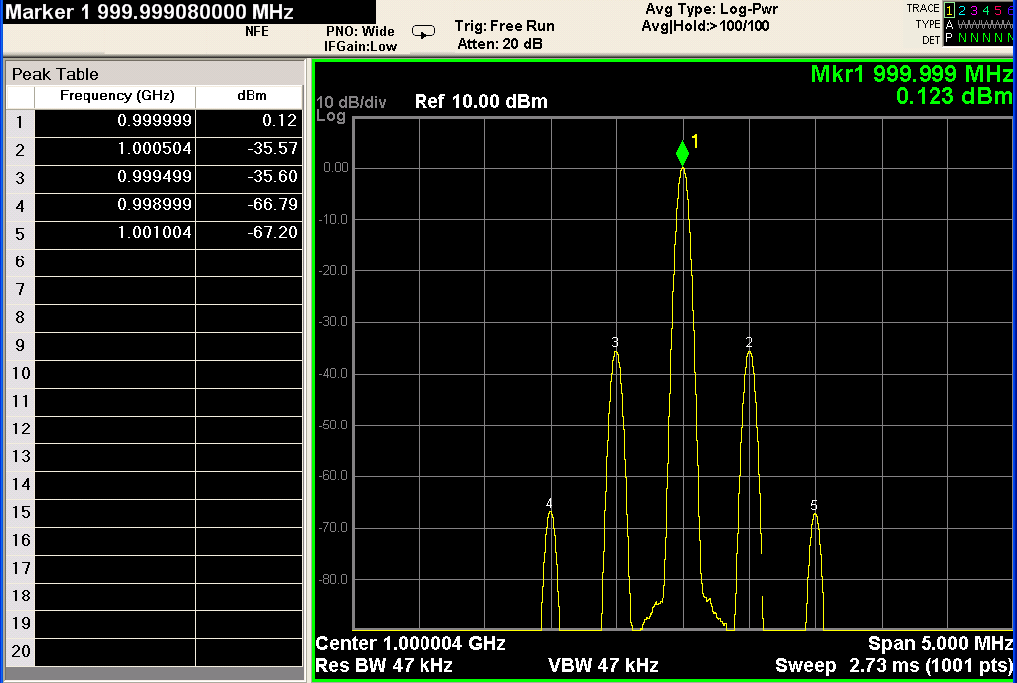 为了证明这一点,可通过调制输入DAC的时钟来模拟相位噪声。图7显示5 GHz DAC时钟上有100 kHz的轻度相位调制。其上还绘出了500 MHz和1 GHz的输出频谱。信号音确实遵循了这种关系。从5 GHz时钟到500 MHz DAC输出观测到20 dB降幅,从500 MHz输出到1 GHz输出观测到6 dB增幅。