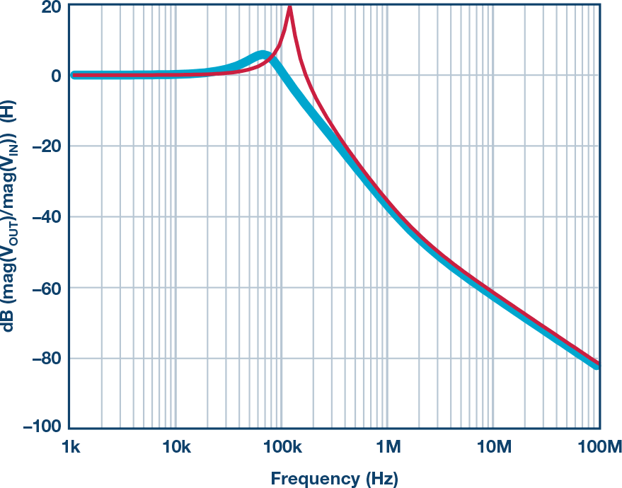 在该设计中,时钟电源也是由ADP1740LDO提供高,但其后接一个LC滤波器。原理图显示了所考虑的滤波器,RL模型表示电感,RC模型表示主滤波电容(C1+R1)。滤波器响应如图20所示,特征谐振用红线表示。正如所料,此滤波器的迹象特征出现在相位噪声响应中,即图21中的蓝色曲线 kHz附近的噪声趋稳,随后急剧下降。幸运的是,LC滤波器峰化不够严重,未引起明显的尖峰,但滤波器仍可改善。这里采用的方案是再增加一个较大电容和一个适当的串联电阻,用来消耗能量。图中所示的串联电路由22 μF电容和100 mΩ电阻组成,它使响应平稳很多(蓝色曲线)。最终结果是此频率偏移附近的相位噪声得到改善,参见图21中的黄色曲线.LC滤波器和去Q网络