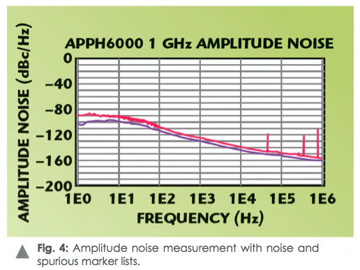 图 4 显示了从 Anapico 信号发生器之一在 4 GHz 下获得的幅度噪声,显示了带有用户定义标记和杂散列表的迹线。APPH 还提供对 FFT 分析仪的直接访问,从而可以对电源和控制电压进行噪声分析。具有扩展偏移范围的 APPH6040 以及 APPH20G 提供超过 40 MHz 的带宽和瞬态测量功能。图 3:APPH 与内部参考源的灵敏度(24 秒后)。