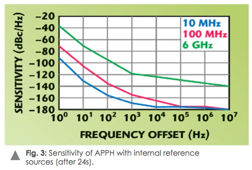图 3 显示了使用内部源进行测量时 APPH 的典型灵敏度,假设测量时间约为 24 秒,偏移范围为 1Hz 至 10MHz。然而,APPH信号源分析仪还可以测量不同驱动条件下放大器的附加相位噪声,以及预分频器或混频器等频率转换设备的相位噪声。此外,还支持幅度噪声测量。